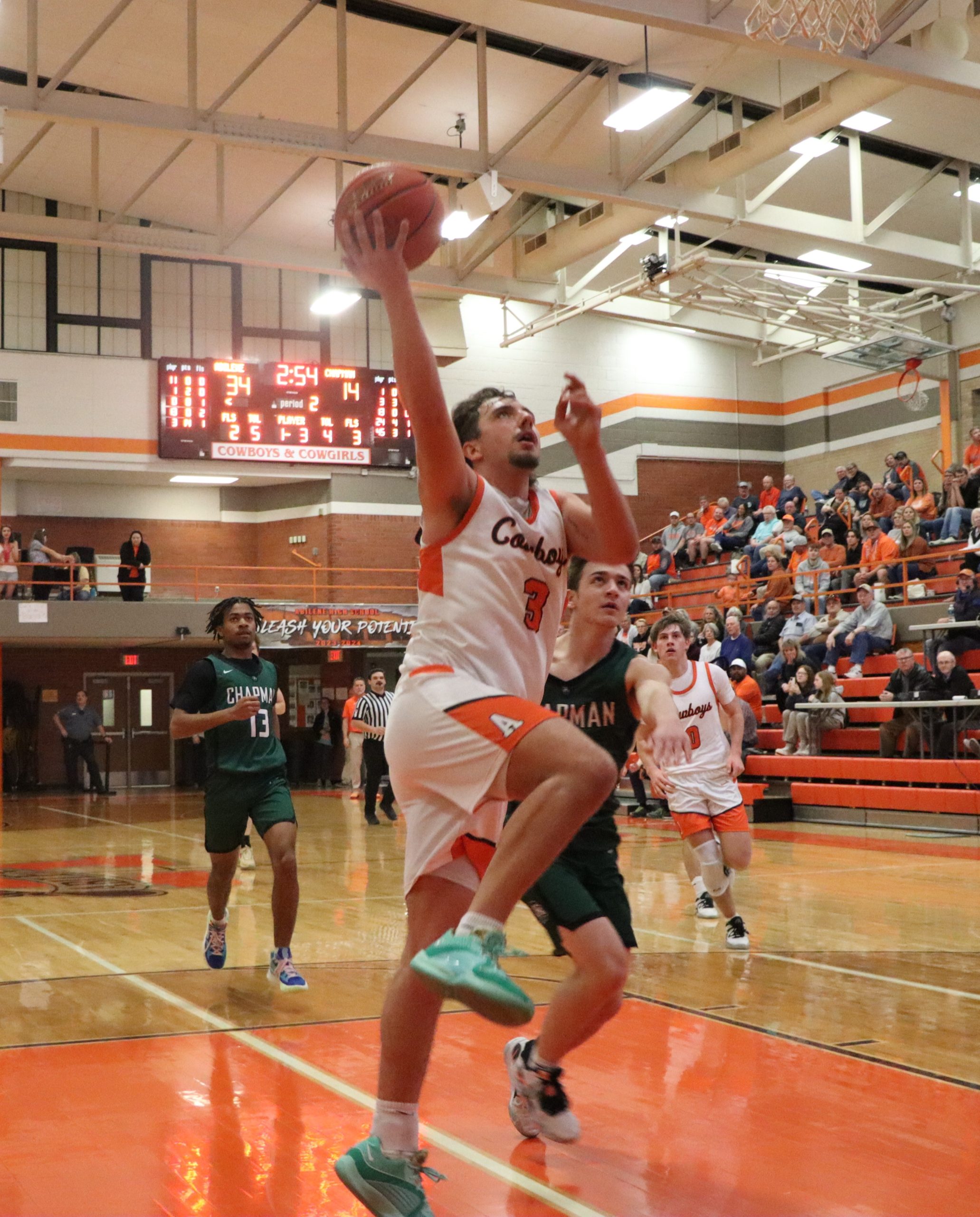 The Cowboys had 8 different players score and they were led by Seniors, Brax Fisher and Stocton Timbrook, who finished with 21 and 18 points respectively. Tyler Holloway reached double-figures with 11 points. Chapman was led by Kelan Gruver, who totaled 21 points in the loss.