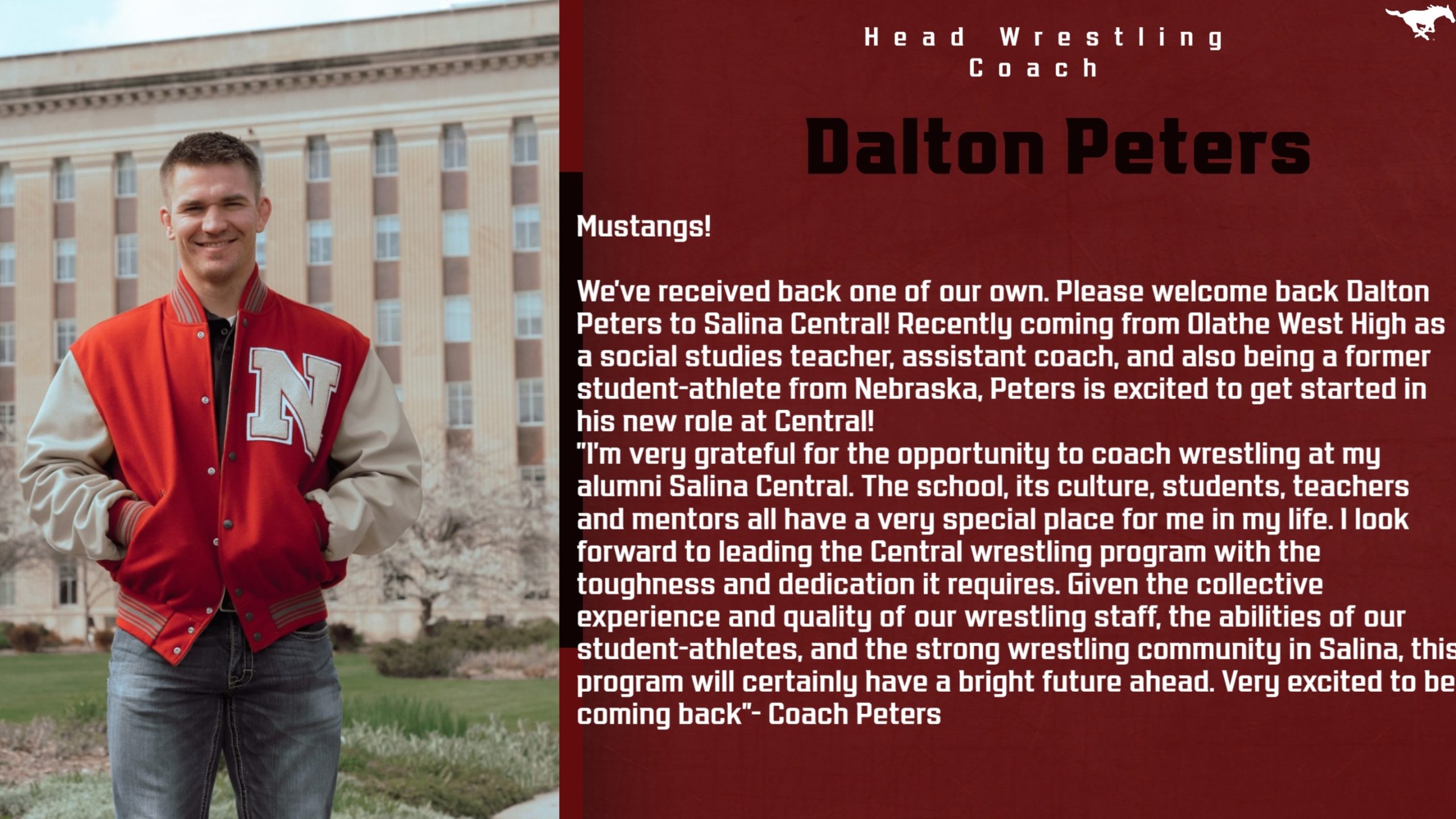 Salina Central High School and Athletic Director Greg Maring announced Tuesday the hiring of Dalton Peters as the next Mustang Head Wrestling Coach, pending board approval.