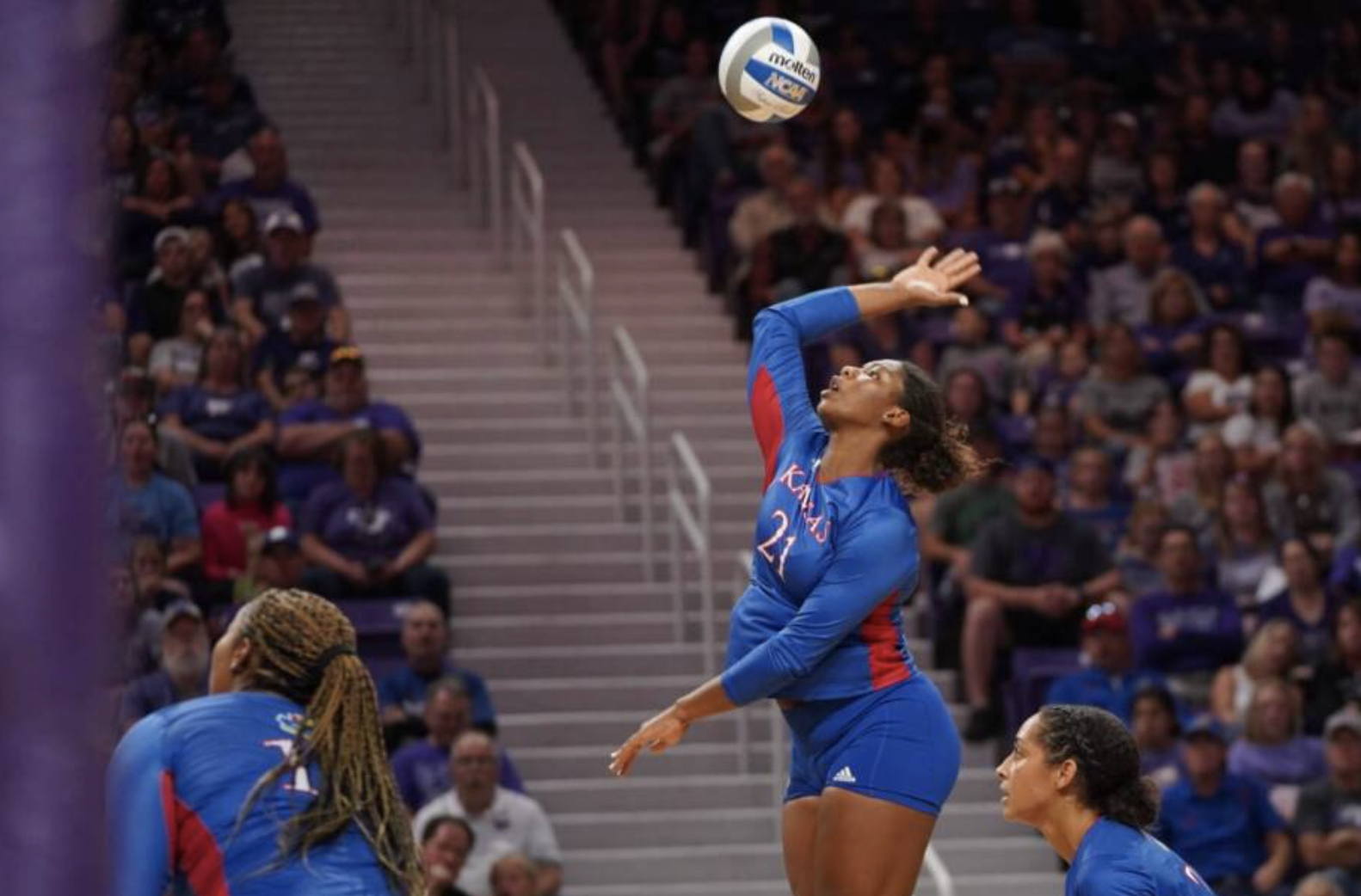 MANHATTAN, Kan. – In the first road Big 12 match of the season, the Kansas volleyball team defeated in-state rival Kansas State 3-2 (25-19, 25-23, 20-25, 20-25, 15-7) in the Dillons Sunflower Showdown at Bramlage Coliseum on September 24.