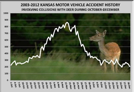Crashes involving deer and vehicle are about to peak. According to the Kansas Highway Patrol, law enforcement works a significant amount of vehicle vs deer crashes this time of year. It will continually be a concern up and until November 13th when crash starts declining.