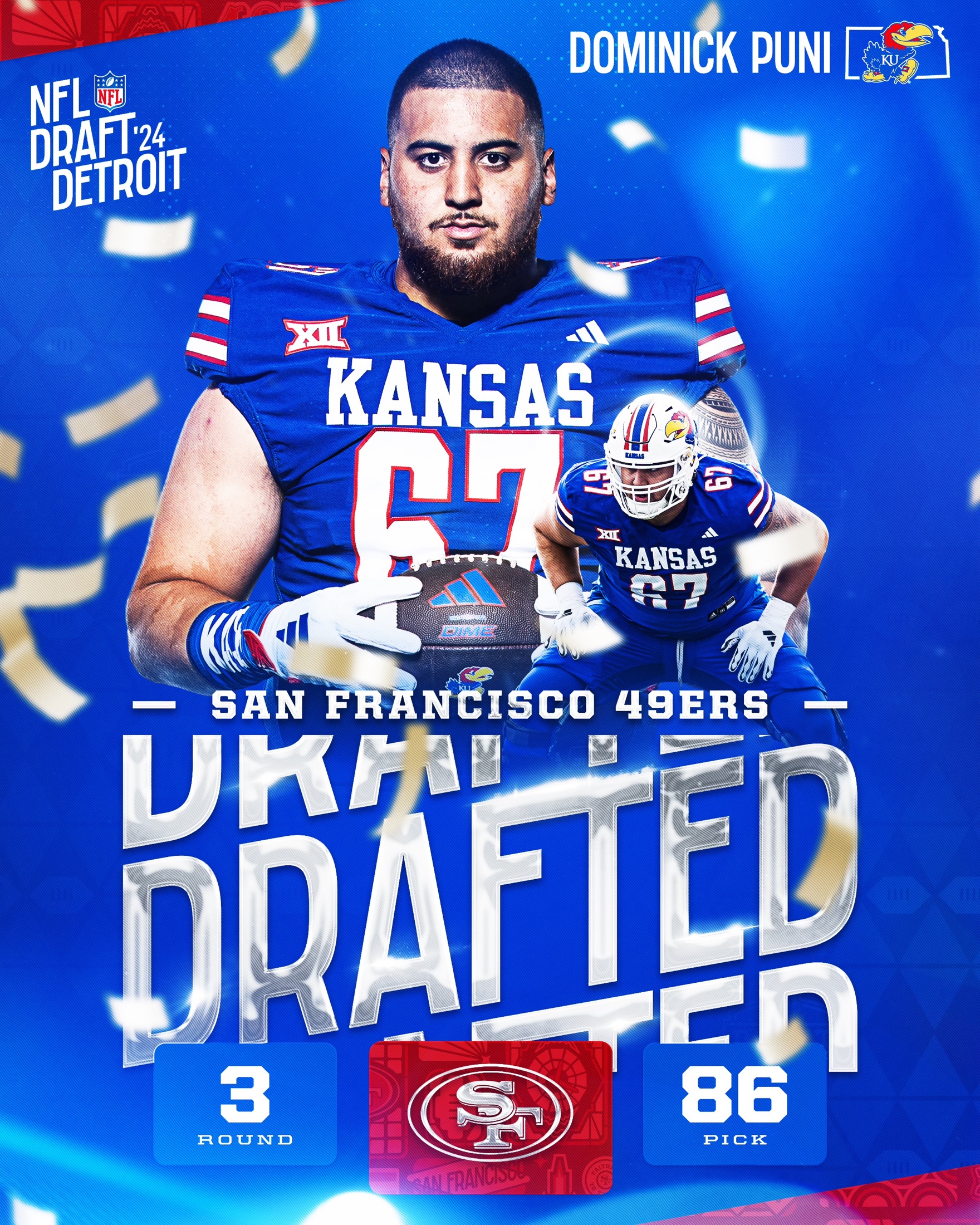 LAWRENCE, Kan. – Kansas Football standout offensive lineman Dominick Puni was selected in the third round of the 2024 NFL Draft on Friday evening, going to the San Francisco 49ers at pick No. 86.