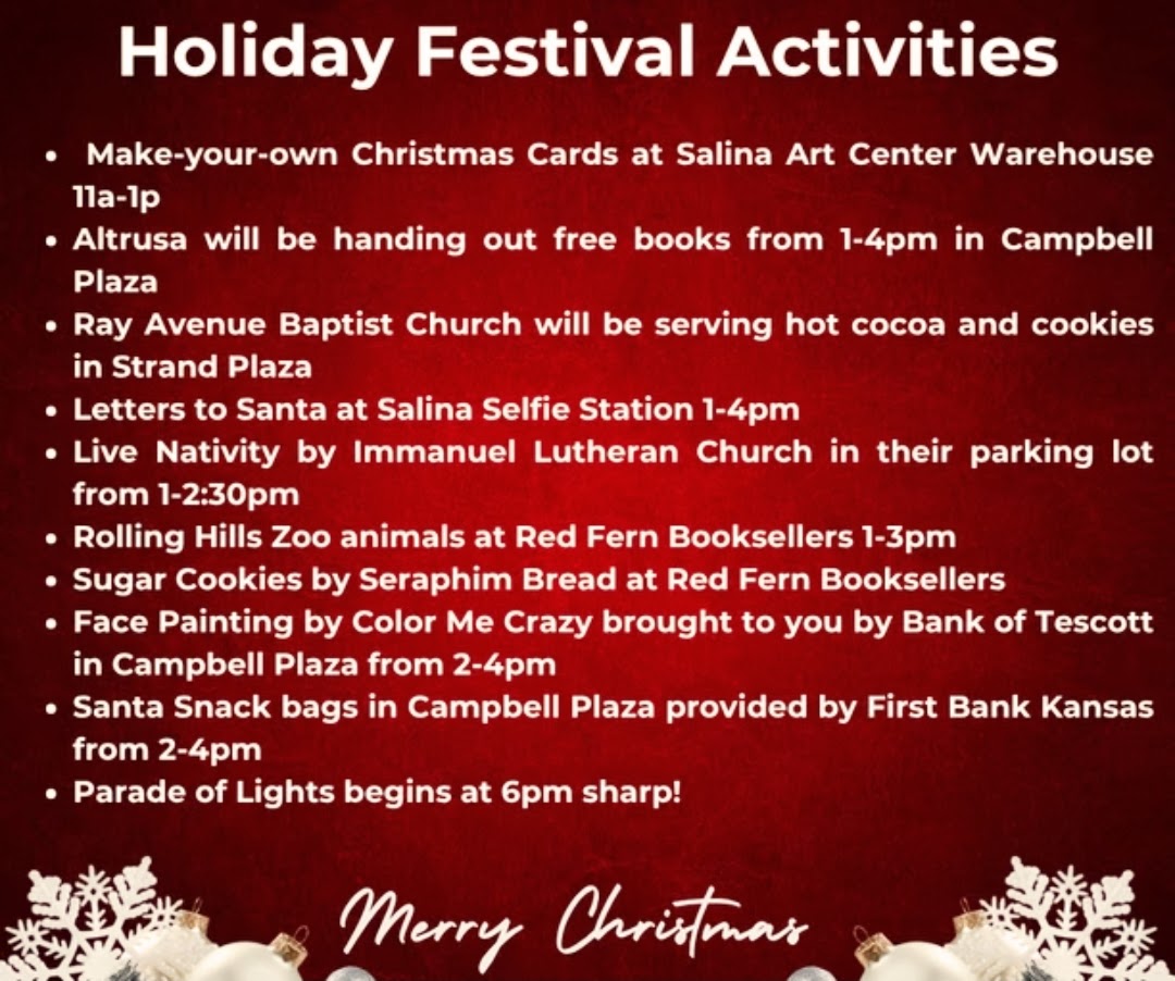 Prior to the big day of events a tree lighting event is planned for Friday night at 7:00. The Mayor & Community Christmas Tree Lighting Celebration will be in Campbell Plaza. Salina Mayor, Greg Lenkiewicz will light the tree, and the Salina Youth Choir will provide festive music.