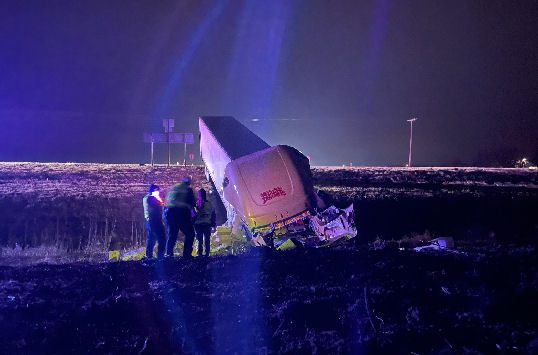 According to the Kansas Highway Patrol, a 2015 Freightliner semi pulling a utility trailer loaded with frozen meat was headed east on K 143 Highway. At the junction of Old 81, the driver failed to yield, crossing the north and southbound lanes of Old 81/K-143 and left the east edge of Old 81, vaulting and coming to rest after striking a ditch embankment.