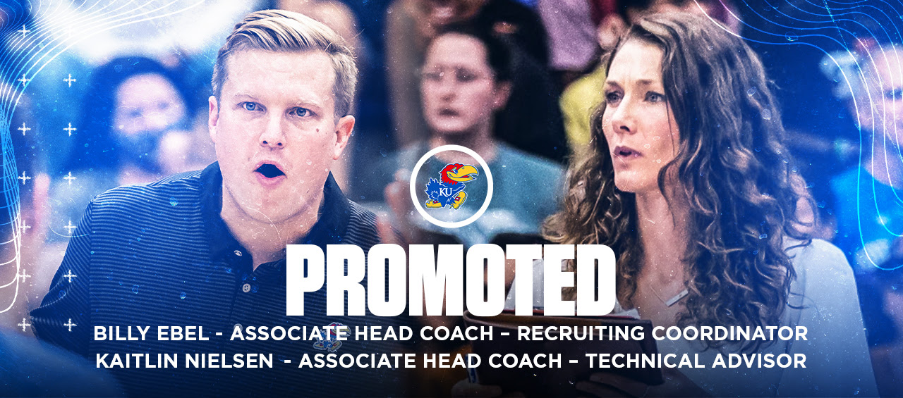 LAWRENCE, Kan. – After a second consecutive trip to the NCAA Tournament, Kansas Head Coach Ray Bechard has announced promotions for assistant coaches Billy Ebel and Kaitlin Nielsen. Ebel was promoted to Associate Head Coach – Recruiting Coordinator and Nielsen was elevated to Associate Head Coach – Technical Advisor.