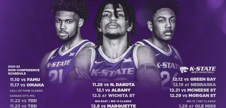K-State previously announced several components of its non-conference schedule, including the Hall of Fame Classic with Arkansas, Cincinnati and Illinois on Monday and Tuesday, November 22-23 at the T-Mobile Center in Kansas City, a matchup with Wichita State at INTRUST Bank Arena in downtown Wichita on Sunday, December 5, a home game with Marquette in the BIG EAST/Big 12 Battle on Wednesday, December 8 as well as road contests at Nebraska on Sunday, December 19 and at Ole Miss in the Big 12/SEC Challenge on Saturday, January 29, 2022.