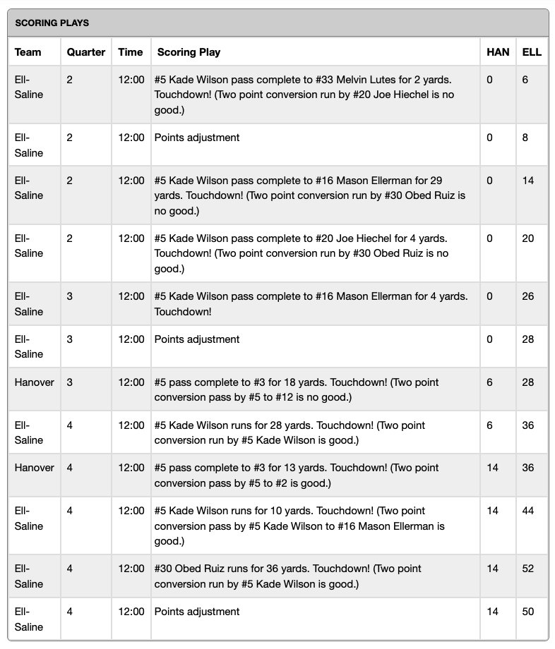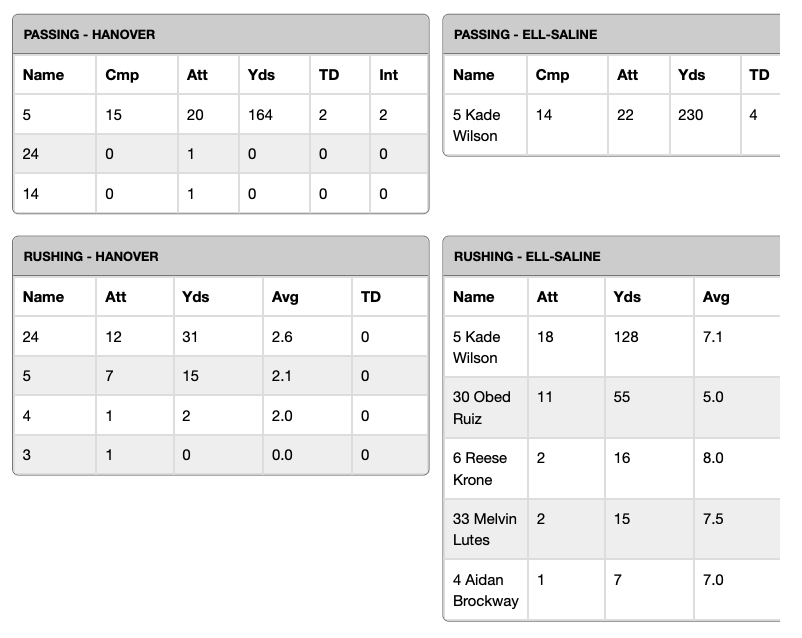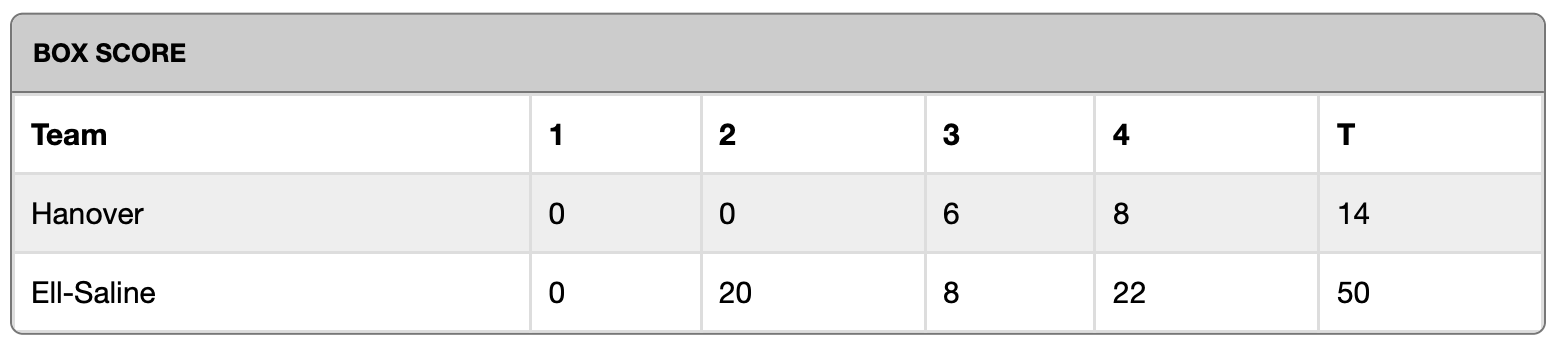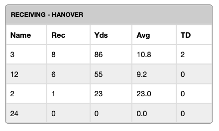 Hanover got on the scoreboard as the clock expired at the end of the third quarter on a TD pass from sophomore quarterback Rieken Stallbaumer to Noah Juenman, also a sophomore, in a play that covered 30 yards.