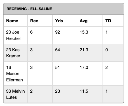 After a scoreless first quarter, Ell-Saline got on the board on the first play of quarter number 2 when Wilson finished off a 60 yard drive with a 2-yard touchdown pass to sophomore Melvin Lutes. Less than 5 minutes of game clock time later, Wilson hit junior Joe Heichel on a 30 yard scoring strike. Then with 3:17 left in the half the Wilson-Heichel combo came up golden again this time on a play that covered 4 yards and the Cardinals took a 20-0 lead into the locker room at intermission.
