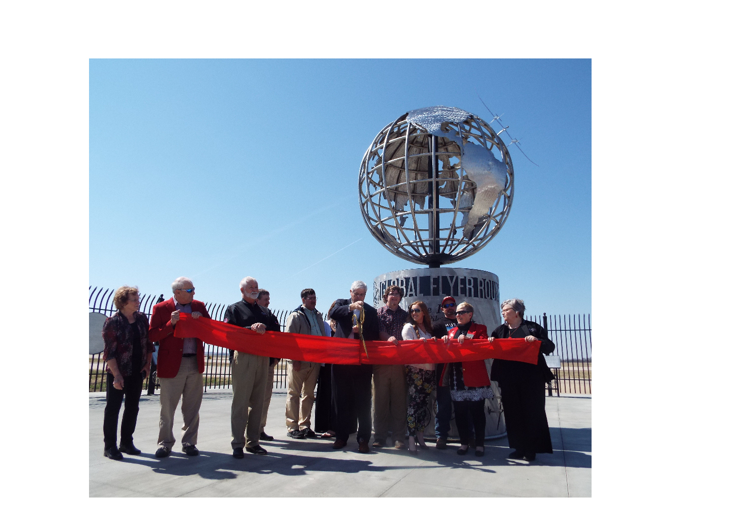 Sculpture artists Bruce and Brent Bitter, from B&B Metal Arts of Hoisington, designed, built and installed a 16-foot-tall monument to Fossett’s record setting flight. The sculpture is the center piece to the Salina Airport’s Fossett Plaza that offers aviation enthusiasts a view of the 12,300-foot runway used by Fossett for his historic flight. The B&B Metal Arts sculpture features a stainless-steel globe with a replica of the Global Flyer in flight over the Atlantic Ocean. The base of the sculpture documents the entire route of the first ever around-the -world, solo, nonstop flight in a manned aircraft.