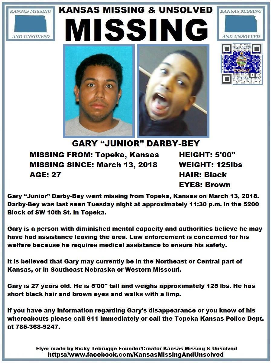 The whereabouts of Gary “Junior” Darby-Bey, 27, are unknown. Darby-Bey is a black male, 5 ft. tall and approximately 125 lbs. He has short black hair and brown eyes and walks with a limp. Darby-Bey was last seen Tuesday night at approximately 11:30 p.m. in the 5200 Block of SW 10th St. in Topeka, Kan.