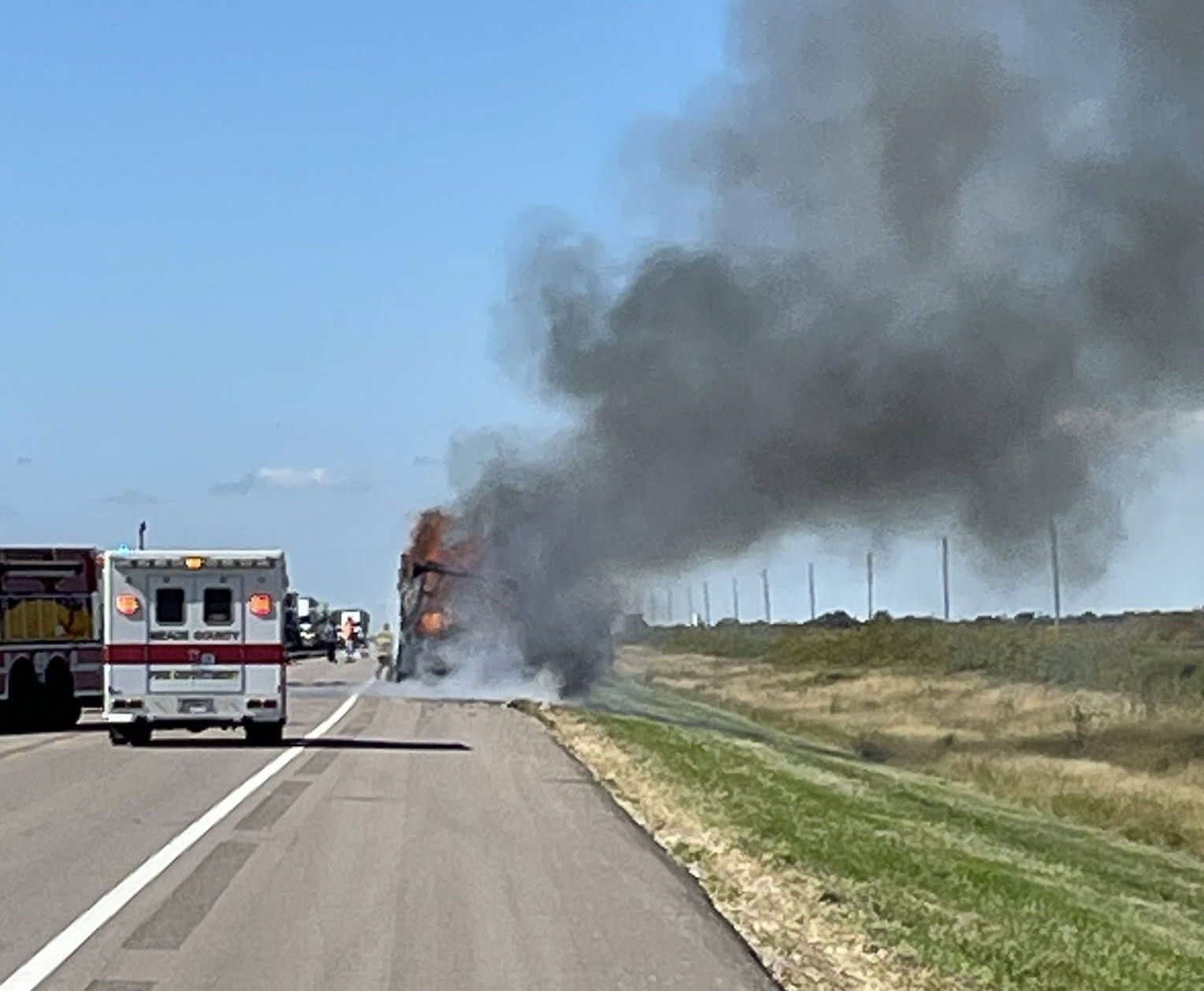 According to the Kansas Highway Patrol, a camper caught fire and became engulfed in flames. Propane tanks on the camper exploded during the incident.