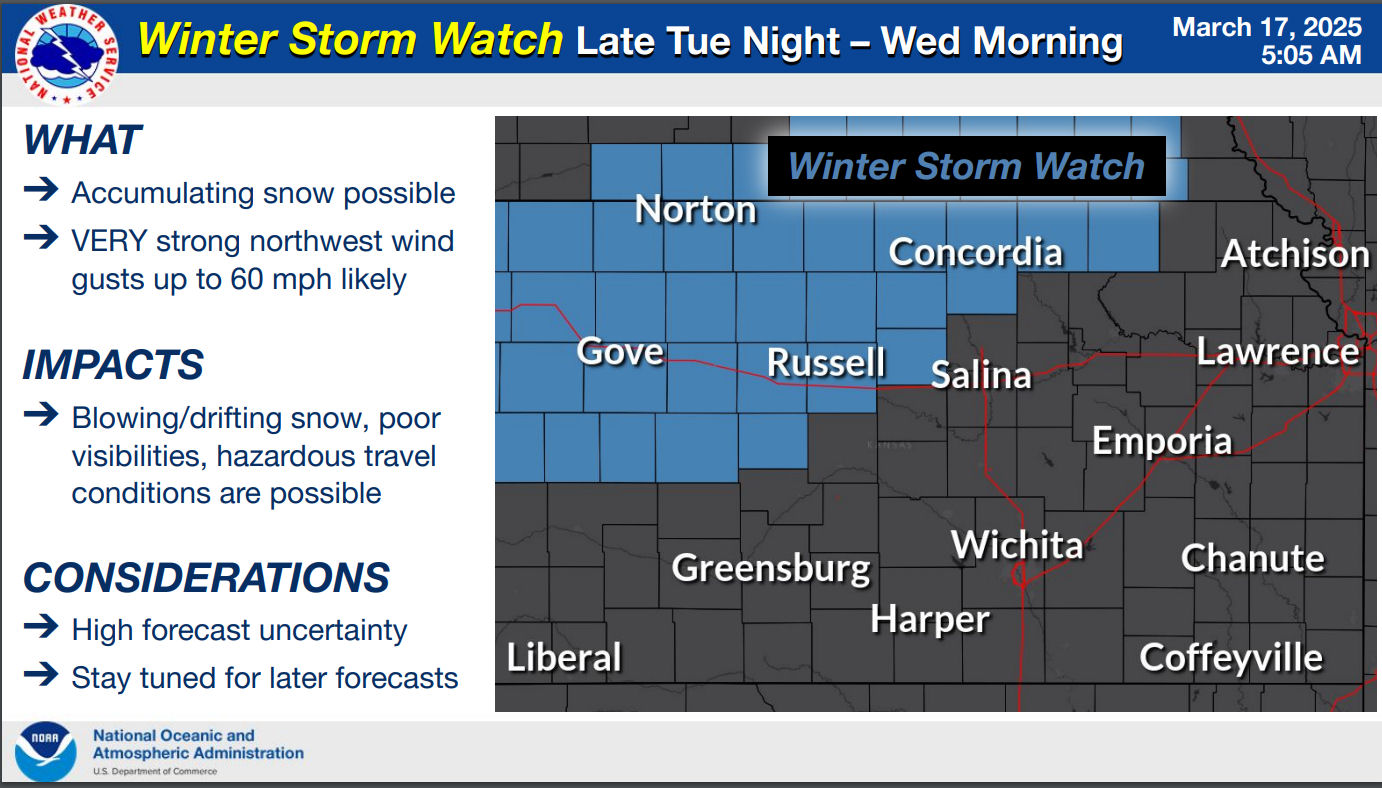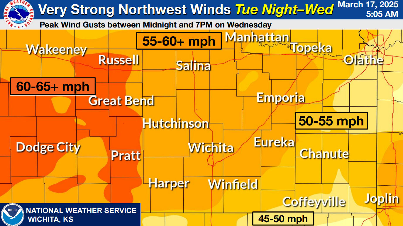 A High Wind Watch is in effect for all of central and south-central Kansas late Tuesday night into Wednesday. Winds could gust 60-65 mph, leading to dangerous travel conditions.