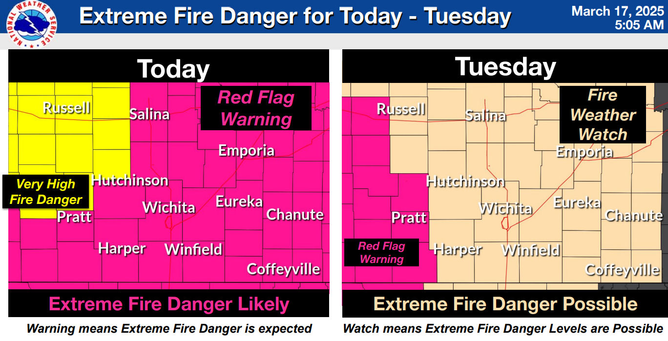 The National Weather Service has issued a Red Flag Warning for south-central and southeastern Kansas today, with Extreme Fire Danger likely on Tuesday. High winds and low humidity create conditions where fires can start easily and spread rapidly.
