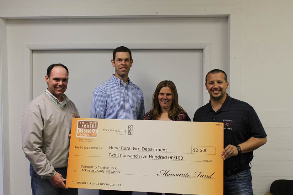 The Hope Rural Fire Department has received a $2,500 donation from Dickinson County farmer Candice Rock and America’s Farmers Grow Communities, sponsored by the Monsanto Fund. The donation will help the organization update their equipment. The department is made up completely of volunteers and serves around 1200 people locally.