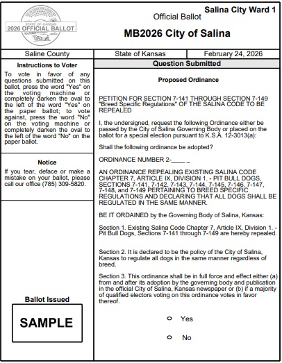On October 27, 2025, a petition to repeal the pit bull dog ban in Salina was presented to the Salina City Manager’s Office. A couple of weeks later the Saline County Election Officer validated the petition.