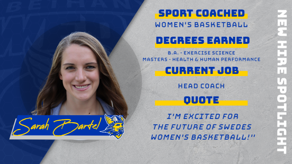 Laura Moreno on the hiring of Sarah Bartel: “We are thrilled for Sarah Bartel to take the reins of the women’s basketball program. As a Bethany alum of the program as well as an assistant coach for the Swedes the past couple years, she is deeply rooted and well-connected to both current and future student-athletes, the department, the college, and the community. Coach Bartel’s experience, approach, passion, and ability to build and prioritize relationships make her the tremendous fit for this position. We are excited to see the women’s basketball program continue to thrive with Coach Bartel at the helm!”