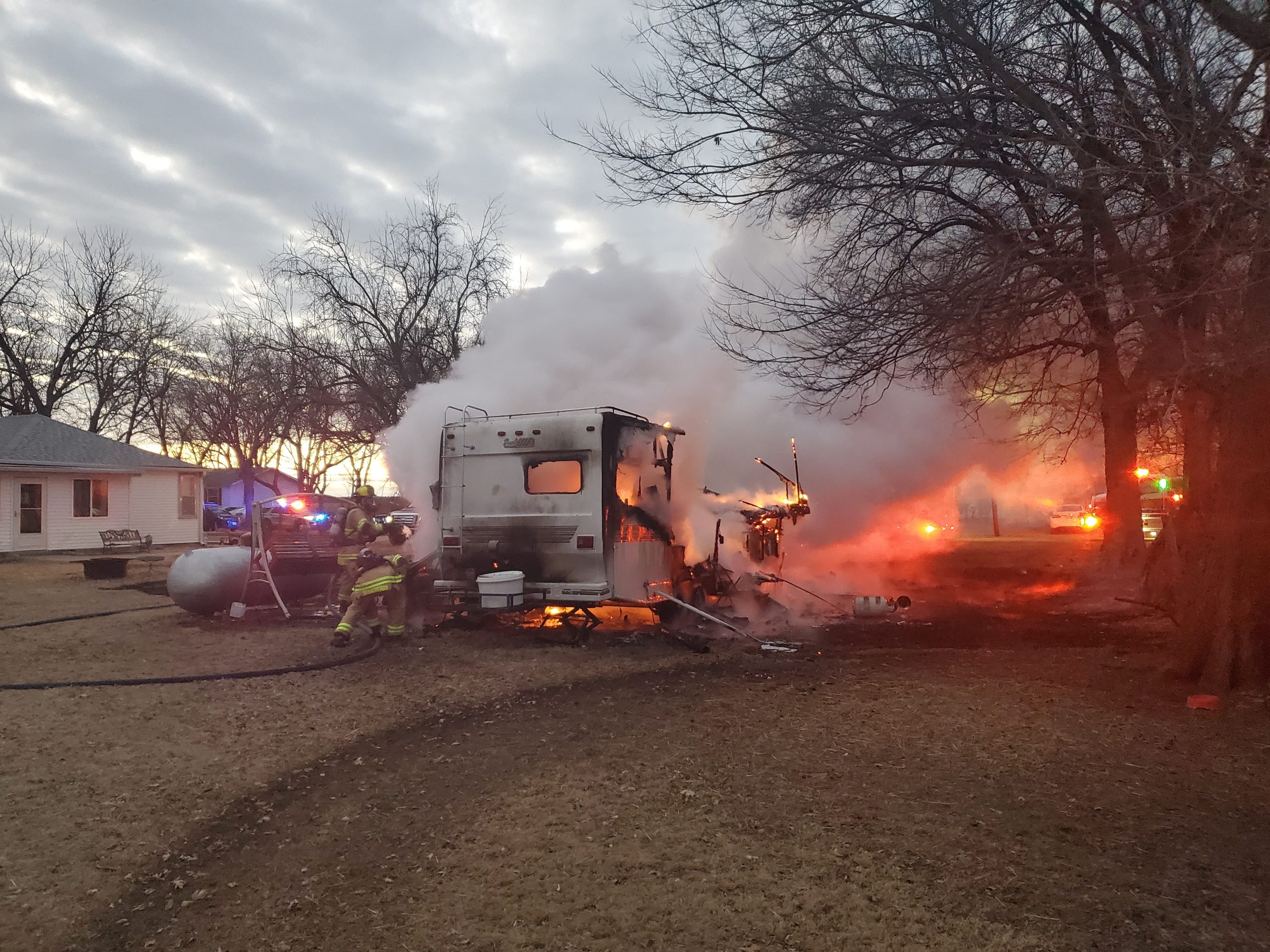 Saline County Sheriff Roger Soldan tells KSAL News that the 34-foot camper was parked on a property in the 200 block of E. 2nd Street in New Cambria when a fire destroyed the fifth wheel camper Sunday morning around 7am.