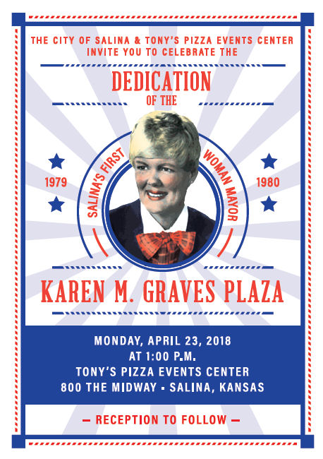 The City of Salina will honor former Mayor and City Commissioner Karen Graves by designating the north plaza of the Tony’s Pizza Events Center as the “Karen M. Graves Plaza.” Graves served on the Salina City Commission from 1977-1983, including a term as Salina’s first woman mayor in 1979-1980.