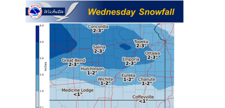 The highest accumulations are expected to remain along the I-70 corridor where 2-4 inches will be possible. A sharp gradient will exist as you move south, with only trace amounts possible along the Oklahoma state line.