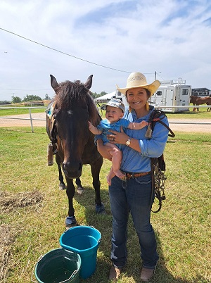 Irvine doesn’t compete full time; she has a fulltime job and is a mother of a nine-month-old son. She goes to the rodeos close to her, and often travels with her mom and sister, who take turns babysitting.