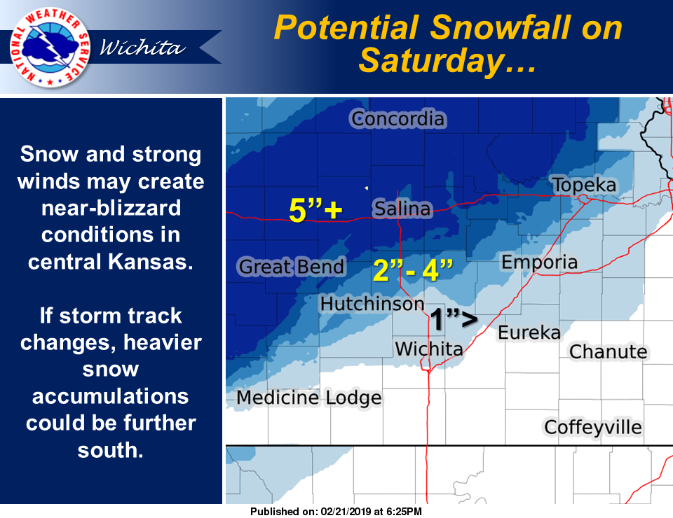According to the National Weather Service in Wichita, moderate to heavy snow and near-blizzard conditions are possible across north central and western Kansas Saturday into Saturday evening, as a strong storm system approaches from the southwest.
