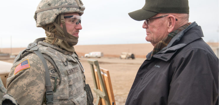 While at Fort Riley, Sullivan, who served as 1st Inf. Div. commanding general from July 1988-July 1989, took an aerial tour of the post to get a wide look at housing and training facilities. He also visited Soldiers of 2nd Battalion, 34th Armor Regiment, 1st Armored Brigade Combat Team, as they conducted a gunnery at Douthit Range Complex, and gave a talk about developing leaders to senior noncommissioned officers and officers, garrison employees and local community members at Riley’s Conference Center.