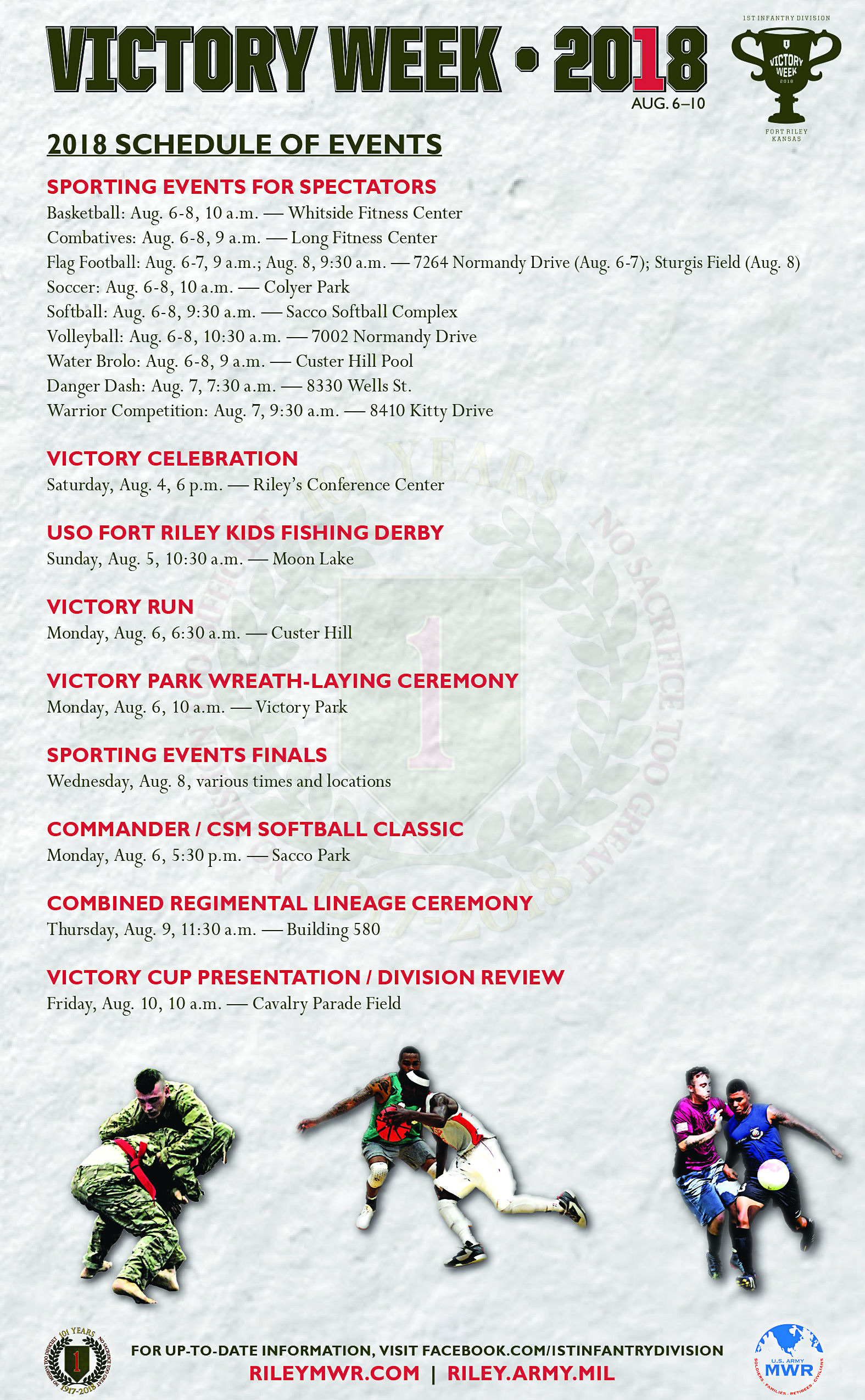 Members of the public are encouraged to attend Victory Week unit sporting events, which will begin on Aug. 6 with basketball, combatives, football, soccer, softball, volleyball and water “brolo.”