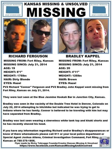 A flier from the Kansas Missing and Unsolved Facebook page says Pfc. Richard “Connor” Ferguson and Pvt. Bradley Kappel were last seen July 21. Military records show the men were serving in the 2nd Armored Brigade Combat Team “Dagger.”
