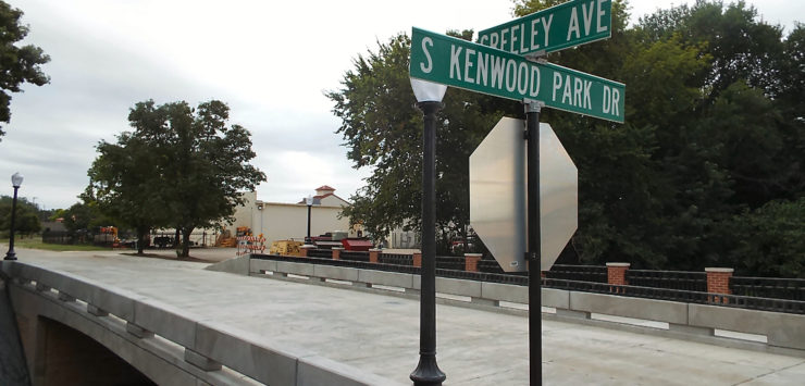 The new bridge includes an 8 feet wide sidewalk, brick pilasters with decorative fence and lighting similar to the bridge into Lakewood Park. Other highlights of the bridge are the aesthetic colored concrete wing walls and the haunched slab design over the old Smoky Hill River Channel.