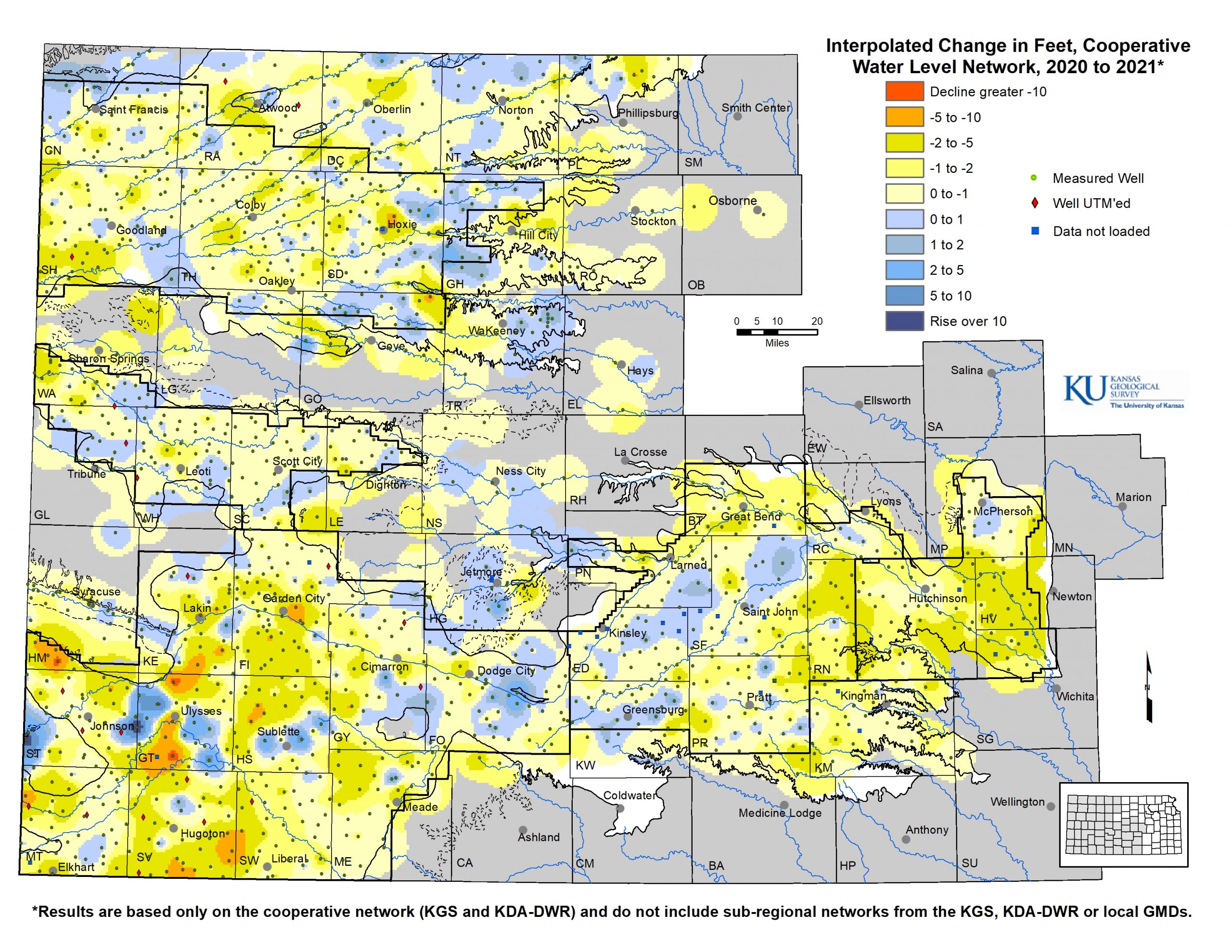 The KGS, based at the University of Kansas, and the Division of Water Resources (DWR) of the Kansas Department of Agriculture measure about 1,400 wells every year to monitor the health of the High Plains aquifer and other aquifers in western and central Kansas. Since 1996, when the state began administrating the water-level program, water levels in the monitored wells have declined on average 12 feet.