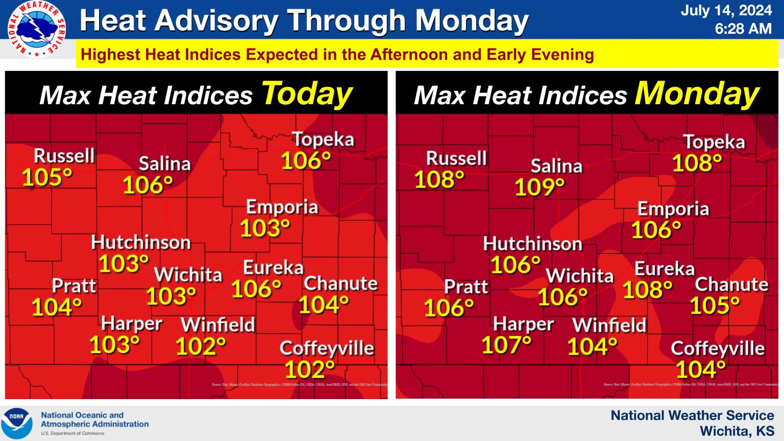 According to the National Weather Service, on Sunday and Monday afternoon and into the early evening heat indices will range from 104 to 109 degrees. A heat advisory will be in effect for much of the state, including all of Central Kansas, beginning Sunday afternoon.