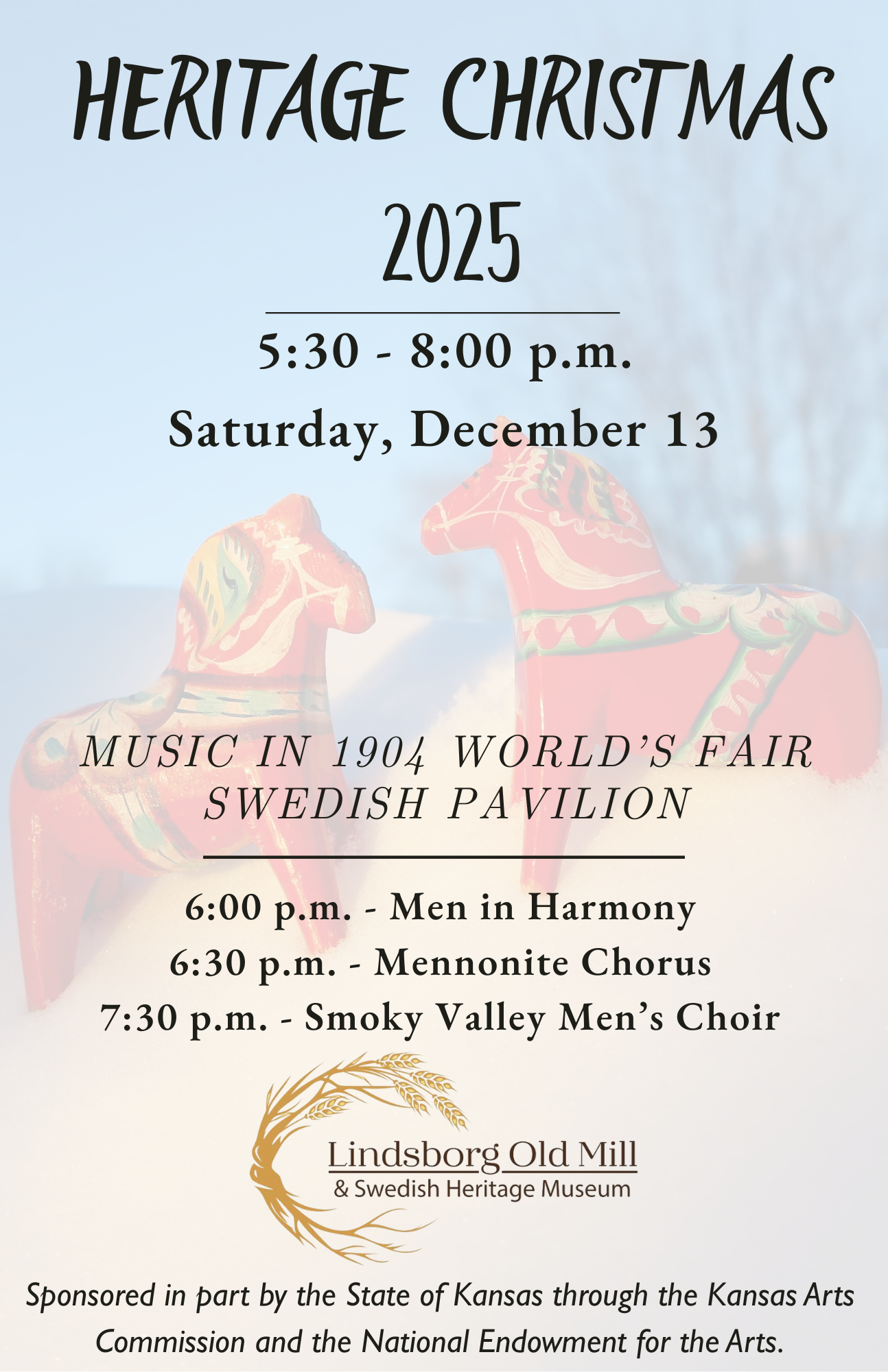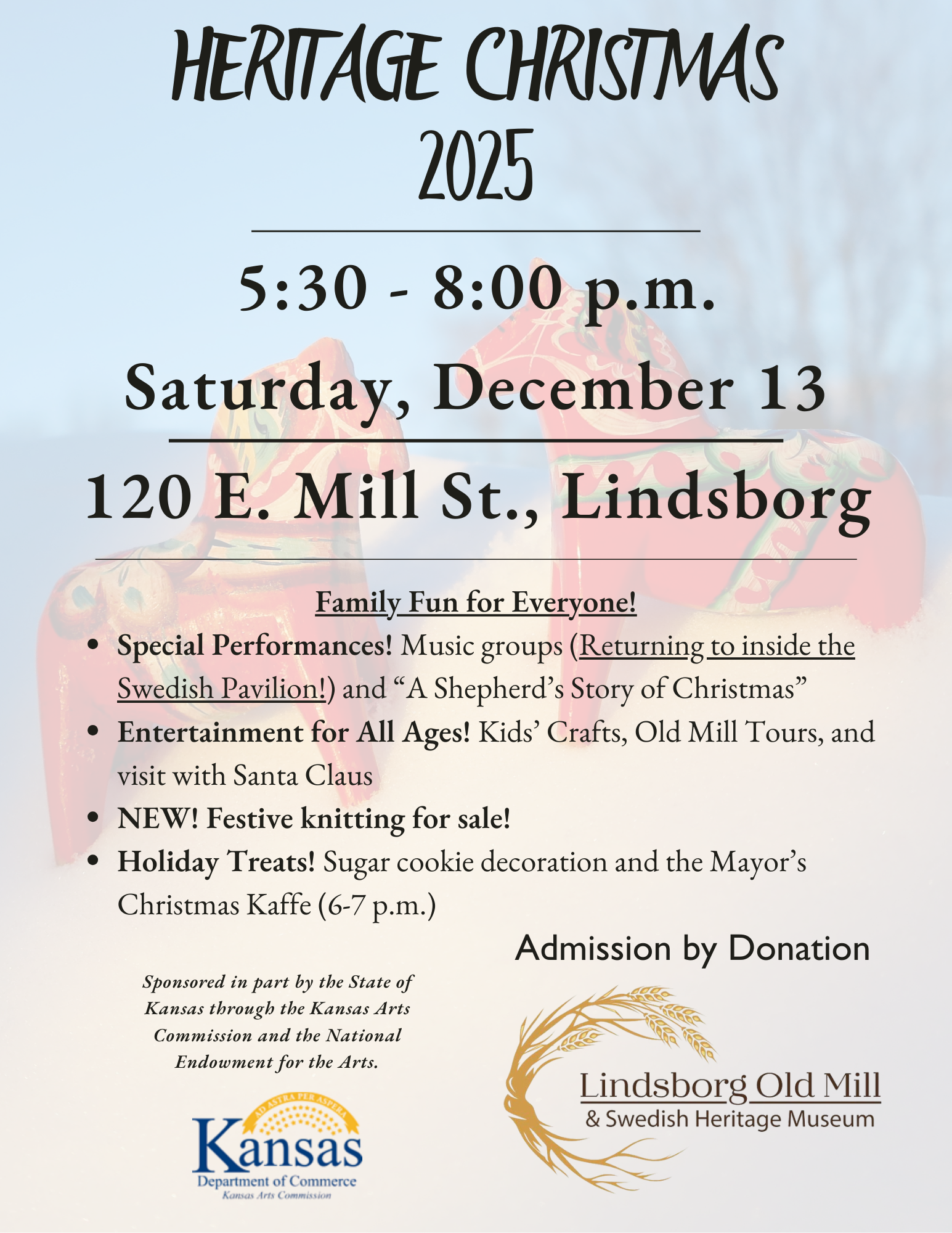 Heritage Christmas is this Saturday, December 13th, from 5:30 to 8:00 p.m. at 120 E. Mill St. in Lindsborg.