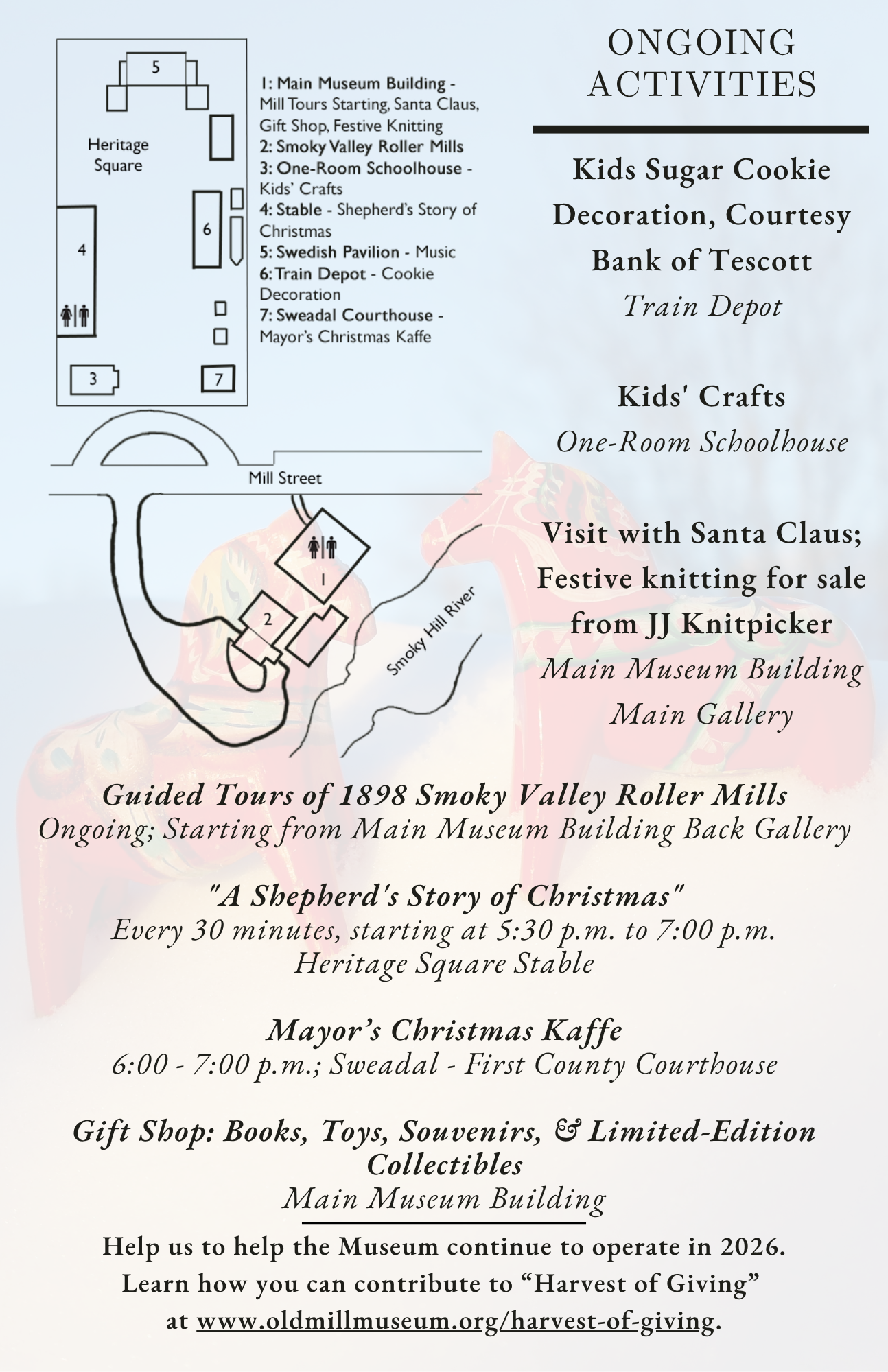 Visitors will stroll along lamplit paths and step into a festive mix of music, crafts, storytelling, and hands-on holiday fun. Families can decorate cookies, create kid-friendly crafts, enjoy a dramatic performance, tour the historic 1898 Smoky Valley Roller Mills, and share a wish with Santa Claus.