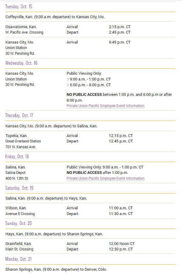 A historic Union Pacific Railroad steam locomotive which periodically tours across the country is out on an eight-week trek, and will chug into Salina for an overnight stop later this week.