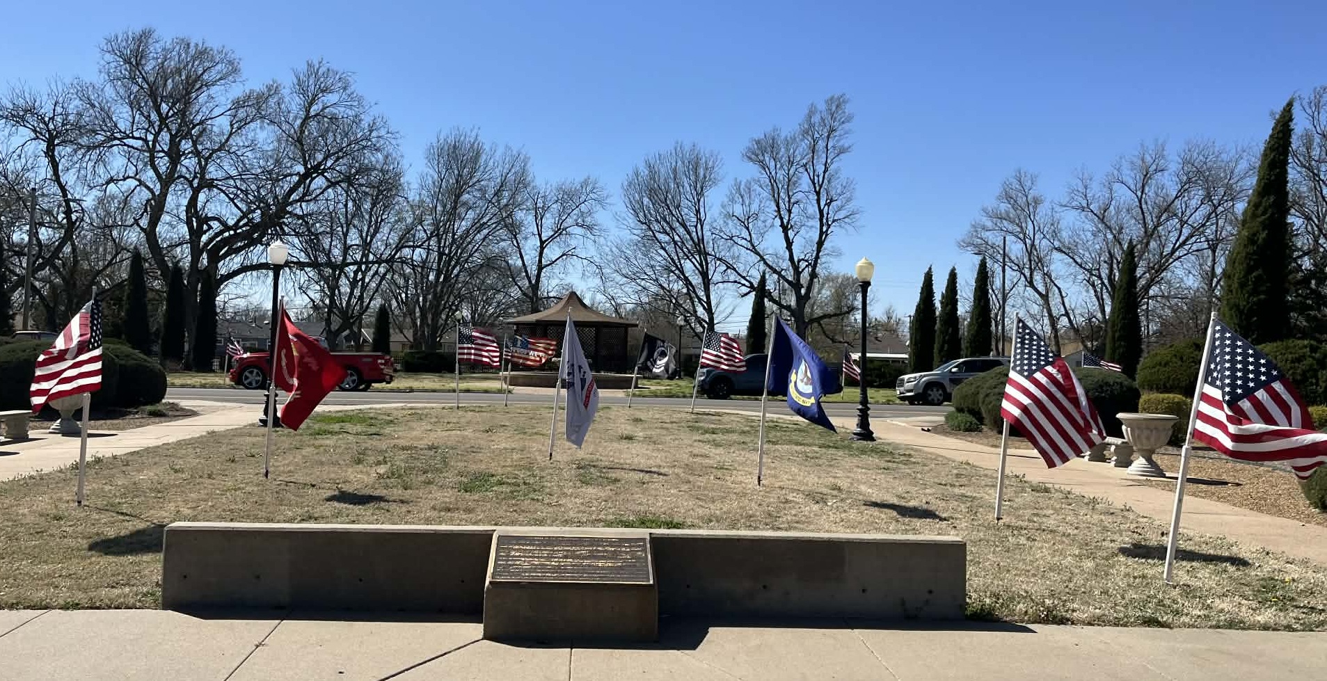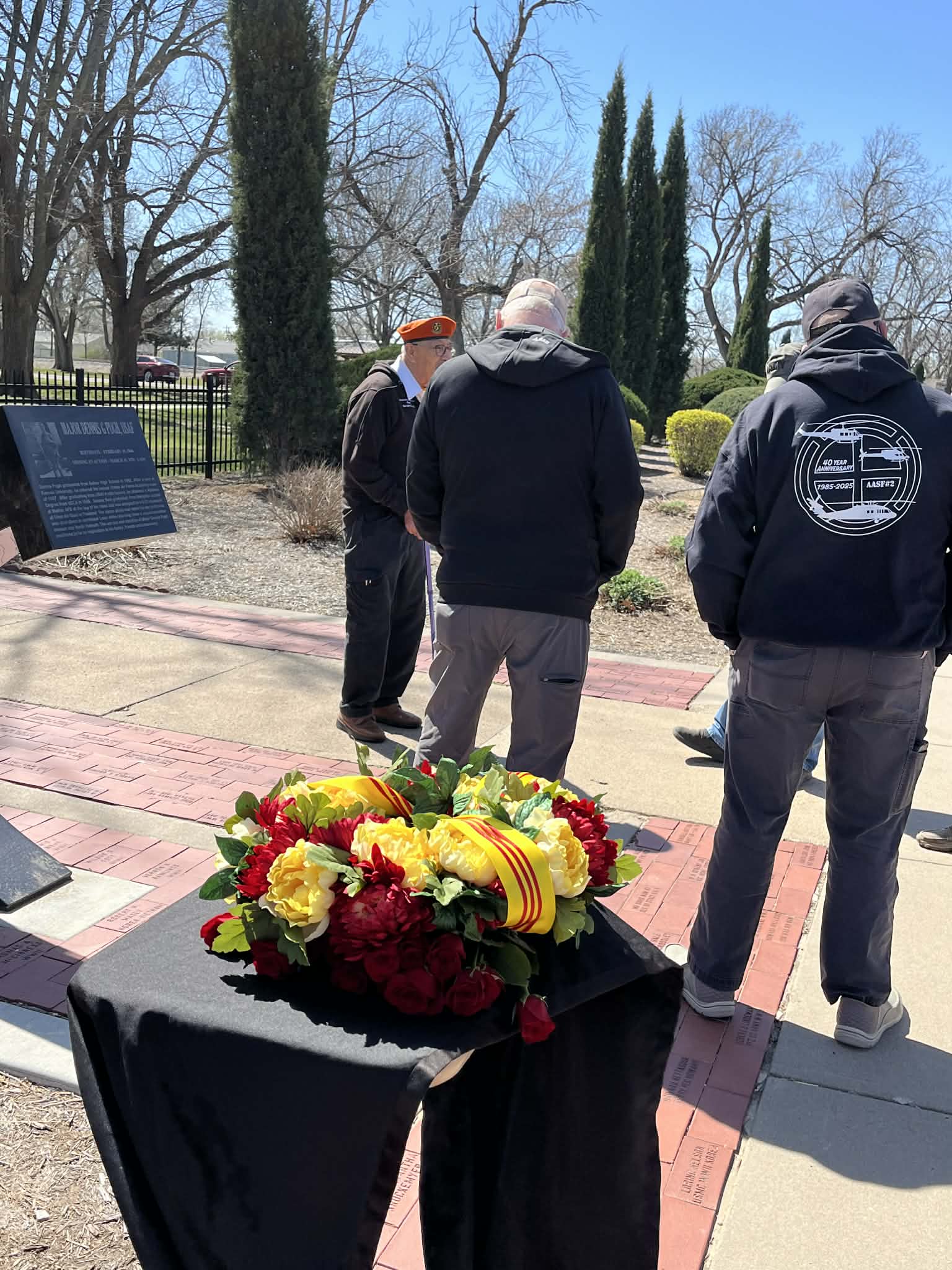 The gathering in Sunset Park came a day ahead of National Vietnam War Veterans Day, which is observed annually on March 29th. The park was beautifully decorated with a row of American flags leading up to the Memorial. American flags and flags of each branch of the military surrounded it.