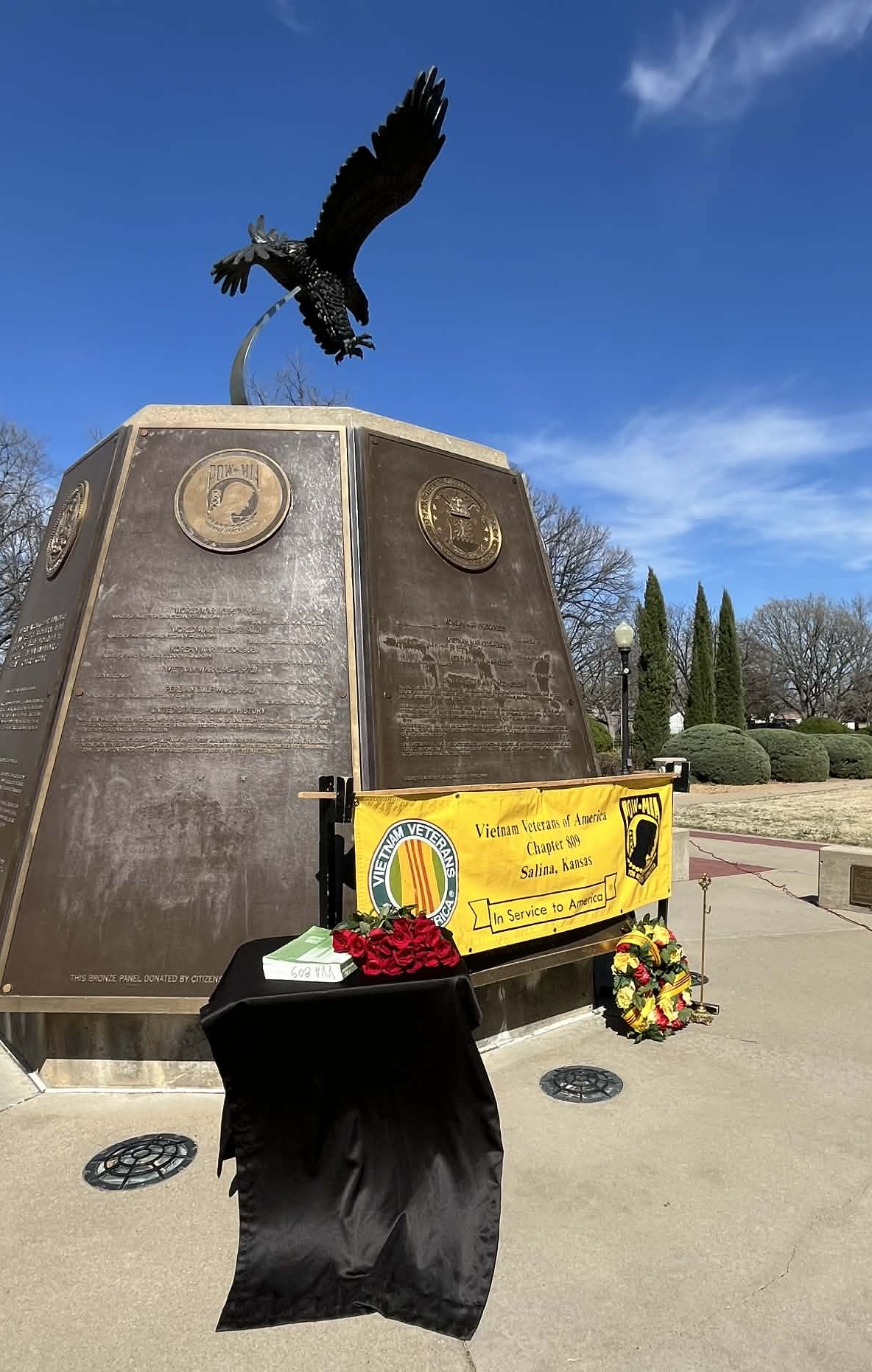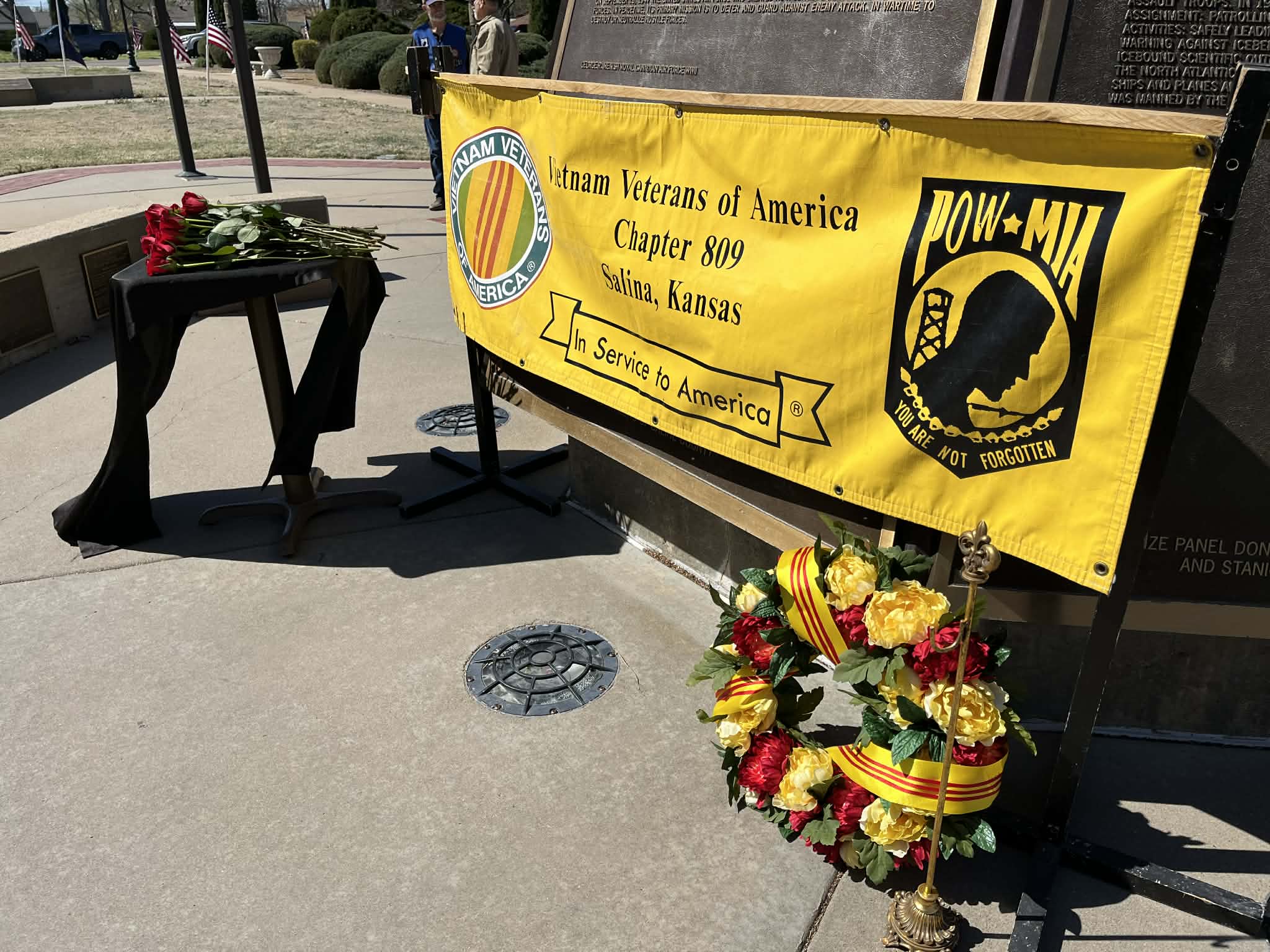 The laying of a wreath began the ceremony. Jim Deister, president of the Salina Chapter of the Vietnam Veterans of America, read the names of the 15 soldiers with Saline County connections who were killed in action in Vietnam. As each name was read, a single rose was presented.