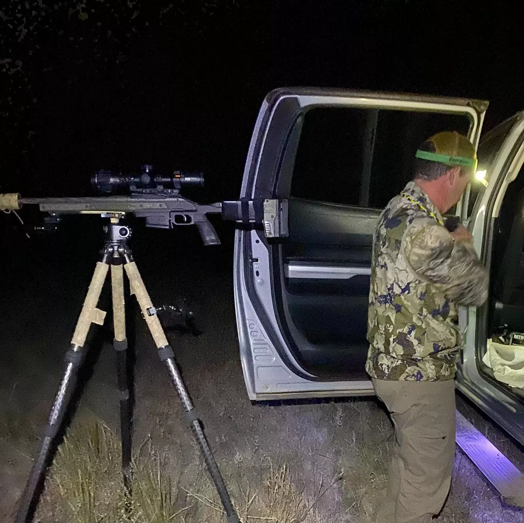 Photo: After the sun sets, David Hampton sets up his rifle in a field. He is hunting coyotes using night vision technology.