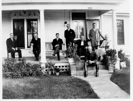 First Lieutenant Dwight D. Eisenhower (seated on the steps) with his family on the south porch in 1926. From Left to Right: his brothers Roy, Arthur, Earl, and Edgar, his father David, his brother Milton, and his mother Ida. (photo via Eisenhower Presidential Library Archives)