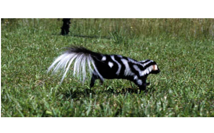 Eastern spotted skunks have a black body with multiple broken white lines and a white triangle on their forehead. They are smaller than striped skunks, but still have the ability to spray repugnant-smelling musk as a defense. In the 1930s, spotted skunks were the third most common furbearer pelt sold in Kansas. Today, they are classified as threatened in Kansas and are rare.