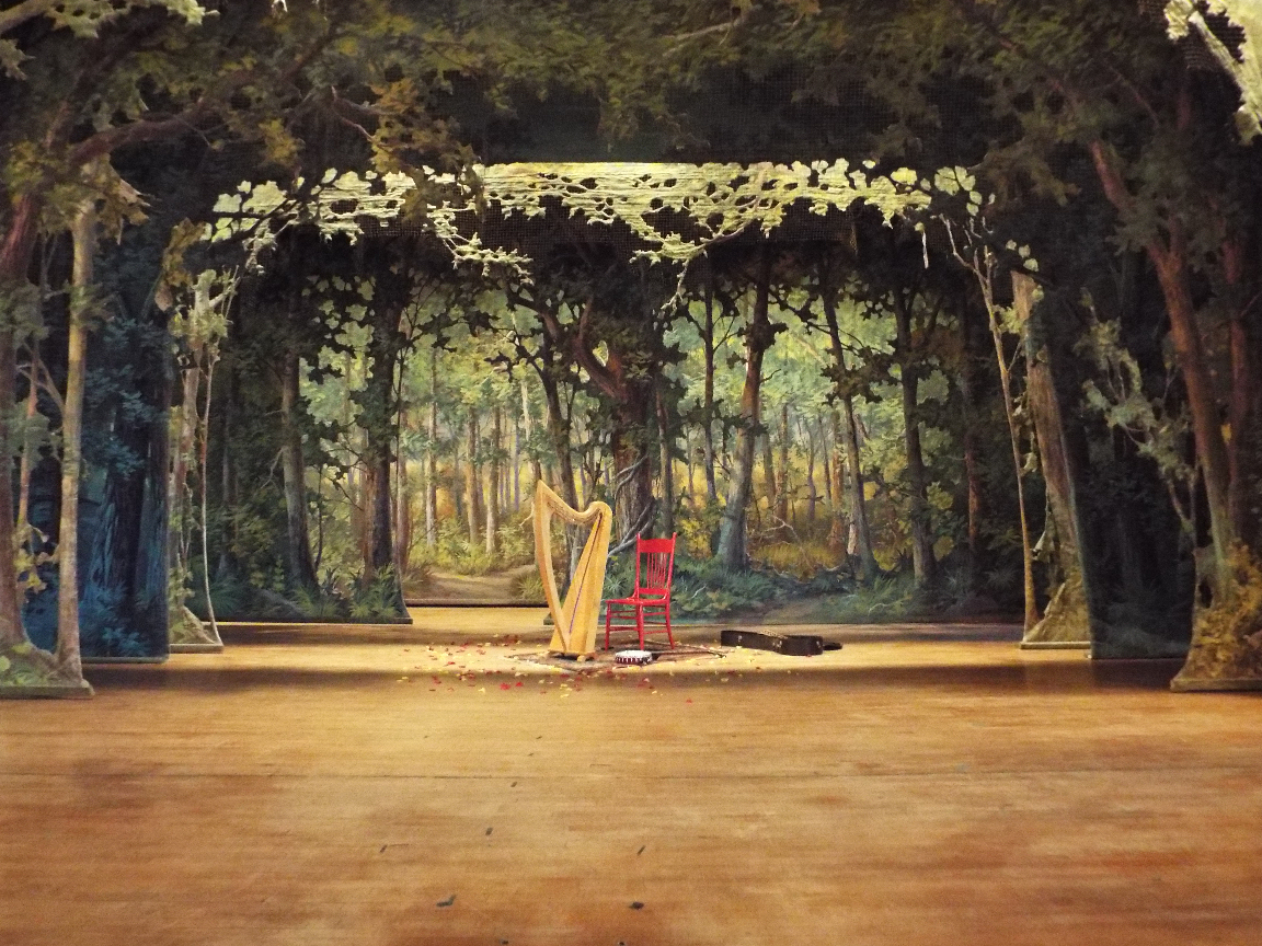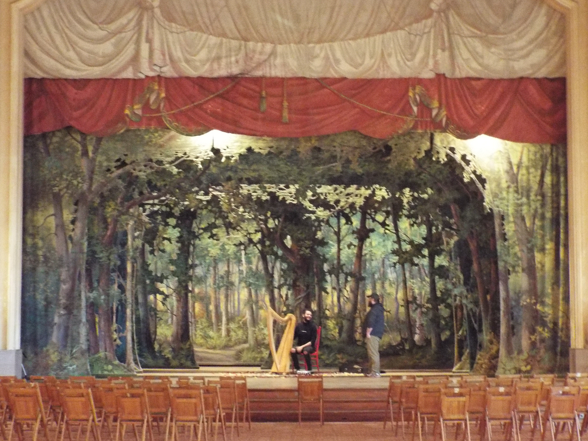 Calvin Arsenia from KC, performs inside the Masonic Center Thursday evening, on a nearly 100 year old stage, with a backdrop that was hand-painted in 1895.