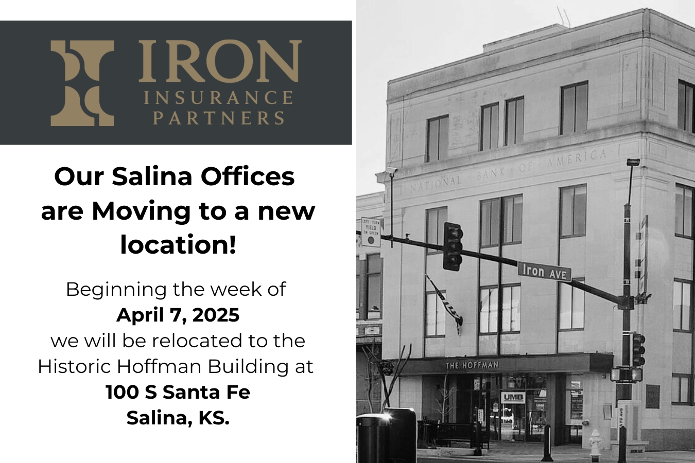 According to Iron Insurance Partners, beginning the week of April 7th, the Salina East and Salina West office locations will combine and move into a newly renovated space in the Historic Hoffman Building at 100 S Santa Fe in Downtown Salina.