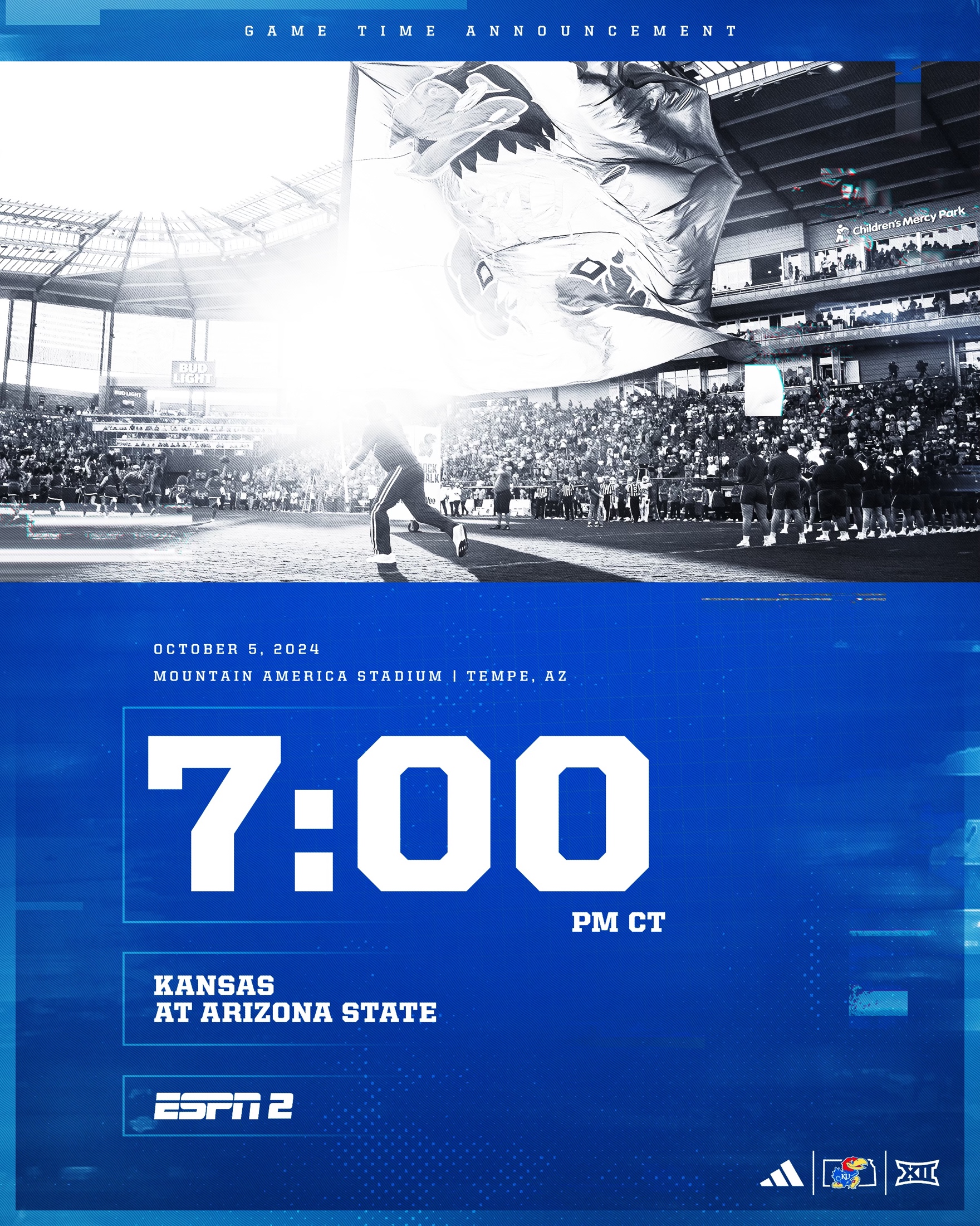 LAWRENCE, Kan. – The Kansas Jayhawks will make their first trip to Tempe, Arizona, to face Arizona State on Saturday, Oct. 5, in a game that will kick off at 7 p.m. CT and be televised on ESPN2, the Big 12 announced Monday.