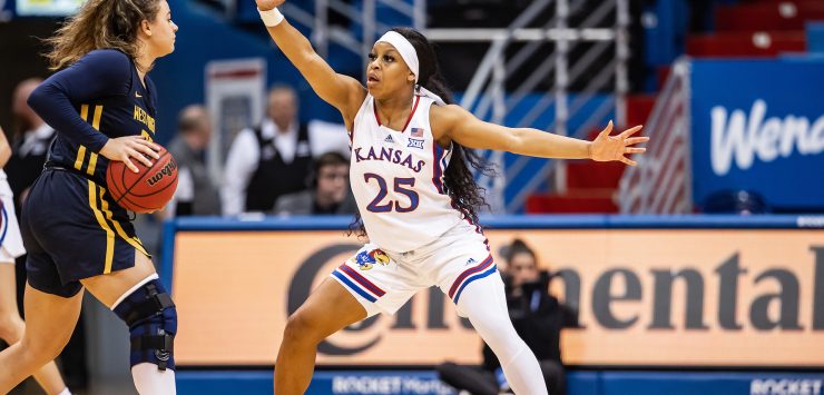 Zakiyah Franklin and Wyvette Mayberry led the Jayhawks with 19 points apiece against West Virginia. It was the third double-figure scoring game of league play for Franklin, who also set a new season-high with seven assists. Mayberry has scored 19 or more points now in three of the past five games, improving her scoring average to 10.9 points per game for the year.