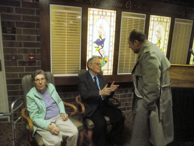 - Ken and June Jennison talk with Salina Arts and Humanities Executive Director Brad Anderson prior to the unveiling.