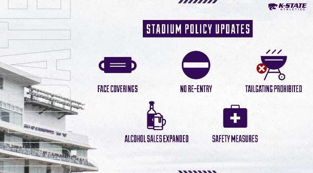 Tailgating will be prohibited in parking lots controlled by K-State Athletics and satellite lots operated by Kansas State University groups in order to reduce the risk of large gatherings. Parking lots will open in conjunction with stadium gates two hours prior to kickoff and fans will be encouraged to immediately enter the stadium once parked.