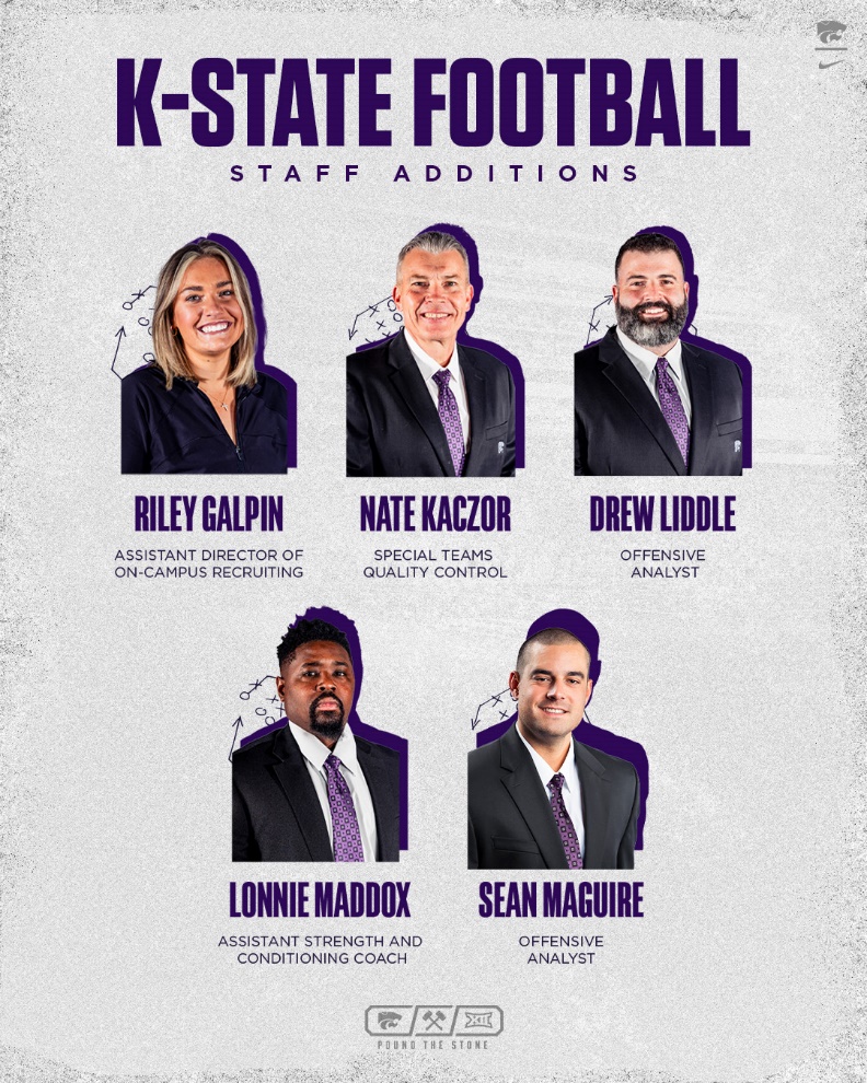 MANHATTAN, Kan. – As spring football practices continue, Kansas State has welcomed the additions of staff members Nate Kaczor, Drew Liddle, Sean Maguire, Riley Galpin and Lonnie Maddox over the last month.