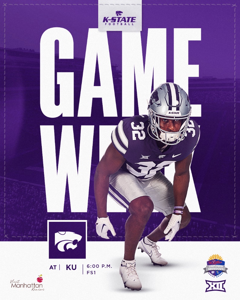 1) Following dominating 59-25 home victory over Baylor in which it scored its most points in a Big 12 game since 2011, No. 23 Kansas State goes back on the road for the final time in the regular season when it heads east on I-70 to face in-state rival Kansas in Lawrence on Saturday night. The game will kick at 6 p.m. and be shown on FS1 with Alex Faust (play-by-play) and Petros Papadakis (analyst) on the call.