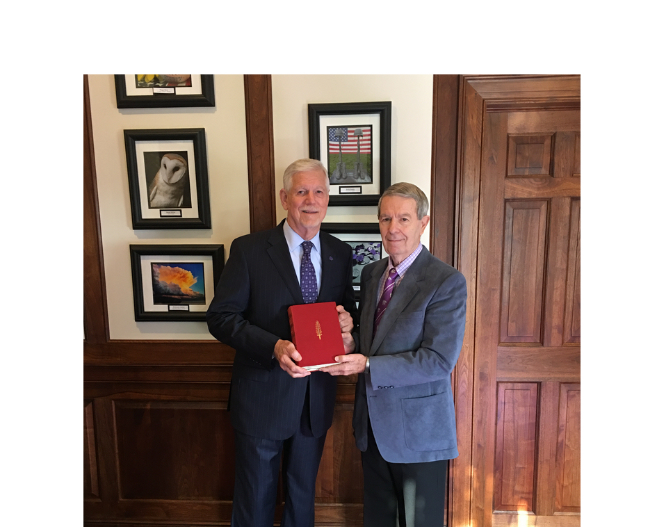 Rees, who was born in Manhattan and earned degrees from Kansas State University in 1961 and 1964, acquired the book from a rare books dealer in Pennsylvania. While presenting the book in President Myers’ office, Rees said, ‘When I learned that the book had been in the possession of K-State’s ninth president, I was determined to return the book to its original home.”