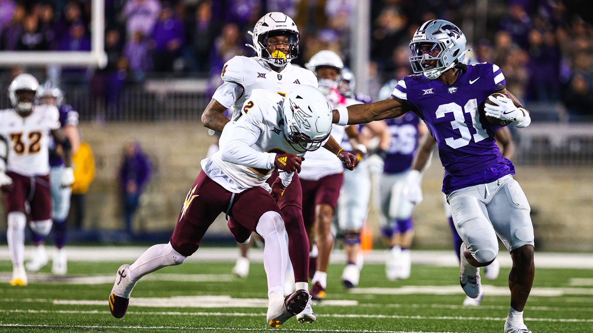 K-State’s troubles started from the game’s second play when Johnson saw his pass to wider receiver Jayce Brown end up in the hands of Xavion Alford off a tipped pass near midfield. Arizona State quarterback Sam Leavitt promptly drove the Sun Devils 49 yards capped by an 11-yard touchdown pass to wide receiver Jordyn Tyson. The score remained 7-0 until early in the second quarter when Leavitt connected with Tyson for a 30-yard score.