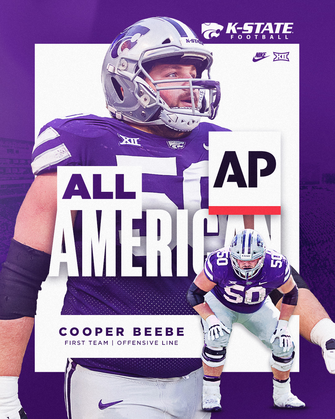 MANHATTAN, Kan. – Kansas State senior left guard Cooper Beebe added two more All-America designations on Monday as he was named a First Team All-American by the Football Writers Association of America (FWAA) and Associated Press, the organizations announced. In addition to Beebe, tight end Ben Sinnott was named a Third Team All-American by the Associated Press.