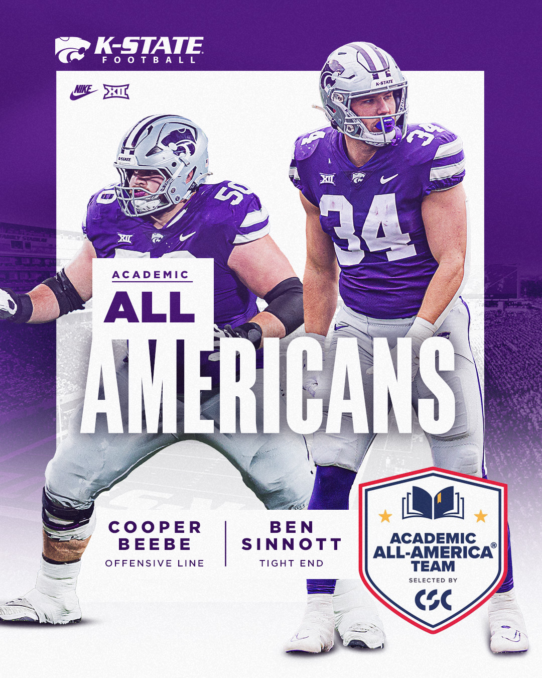 MANHATTAN, Kan. – Following multiple on-field accolades during the 2023 season, Kansas State offensive lineman Cooper Beebe and tight end Ben Sinnott were honored for their work in the classroom on Tuesday as the duo was named to the 2023 Academic All-America football team as selected by the College Sports Communicators.